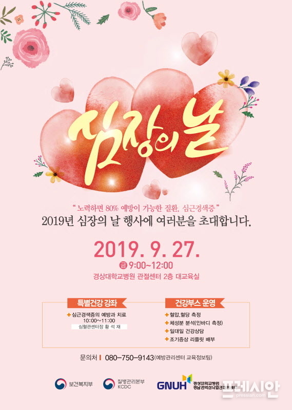 경상대학교병원 권역심뇌혈관질환센터(센터장 최낙천)는 오는 27일 오전 10시부터 관절염센터 2층 대교육실에서 ‘세계 심장의 날’을 맞아 특별 건강강좌를 개최한다고 밝혔다.