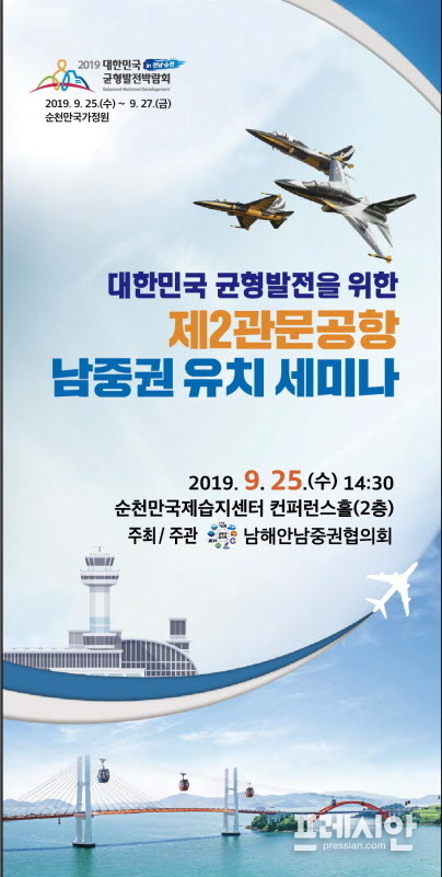 남해안남중권발전협의회는 오는 9월 25일 전남 순천시 순천만국가정원에서 열리는 대한민국균형발전박람회 기간에 맞춰 '대한민국 균형발전을 위한 제2관문공항 남중권 유치 세미나'를 개최한다.