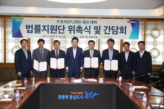 이강덕 포항시장은 이날 위촉식에 참석한 한동대 이국운 교수, 김무겸 변호사(법무법인 로고스), 홍지백 변호사(법무법인 나눔), 문광명 변호사(법무법인 선율)에게 위촉장을 수여하고, 포항지진특별법 제정과 관련해 법률지원단의 적극적인 활동을 당부했다.