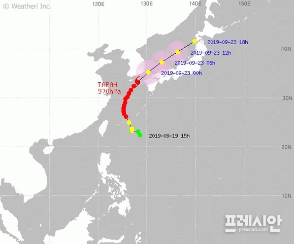 제주도 동쪽 130km(킬로미터)해상에 있는 태풍 타파가 북상함에 따라 오후 10시쯤 가장 큰 영향을 받을 것으로 예상된다.