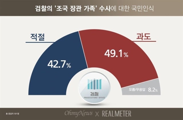 25일 <오마이뉴스> 의뢰로 리얼미터가 조사한 바에 따르면, 검찰의 '조국 장관 가족' 수사에 대한 국민인식은 '과도하다'가 49.1%, '적절하다'가 42.7% 였다. '과도' 의견이 '적절' 의견보다 6.4%p 더 많았지만, 그 차이는 오차범위(±4.4%p) 이내였다.