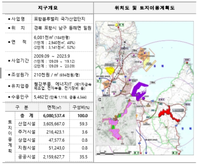한편, 포항 남구 동해면 위치한 포항블루밸리 국가산업단지는 2009년 9월 국가산업단지로 지정됐고, LH가 2023년까지 조성을 완료할 계획이며, 총 지정면적은 608만1천㎡이다.