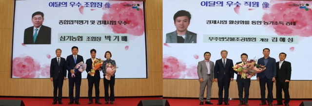 4일 지역본부 정례조회에서 진행된 시상식에서 우수 조합장 부문에 박기배 삼기농협 조합장이, 우수 직원 부문에는 김해성 무주반딧불조공 계장이 각각 '이달의 우수농협인'에 선정됐다.