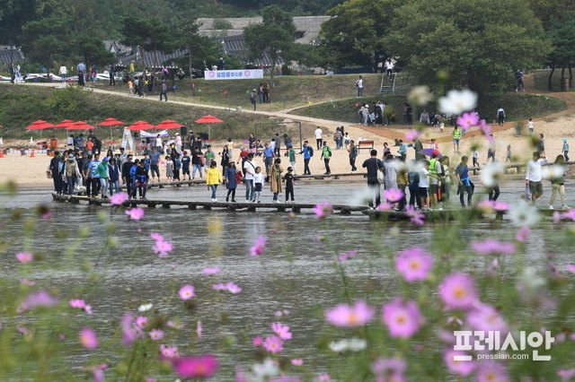 ▲코스모스가 아름답게 핀 무섬외다무다리 축제ⓒ영주시