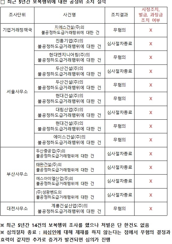 7일 공정거래위원회 국정감사에서 제윤경 더불어민주당 의원(정무위)실이 공정위로부터 받은 자료에 따르면, 지난 5년간 공정위는 총 14건의 보복행위를 조사했으나 이 중 7건은 무혐의, 7건은 심의절차 종료 판정을 내렸다. 단 한 건의 실형도 내려지지 않았다.