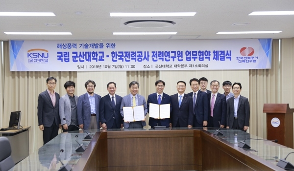 전북 군산대학교 해상풍력연구원과 한국전력공사 전력연구원이 7일 군산대학교 본부 회의실에서 해상풍력 기술개발에 관한 업무협약을 체결했다.