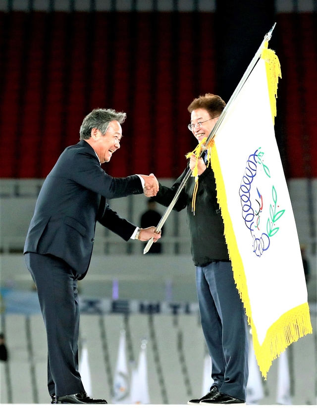 ▲ 이철우지사(오른쪽)가 대회기를 건너 받고 있다.ⓒ경북도