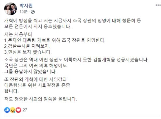 박 의원은 조 장관 사퇴 소식이 전해진 14일 오후 자신의 페이스북에 "(검찰)개혁에 방점을 찍고 저는 지금까지 조국 장관의 임명에 대해서 청문회 등 모든 언론에서 지지 옹호했다"면서 마지막까지 조 장관의 검찰개혁 의지를 높게 평가했다.