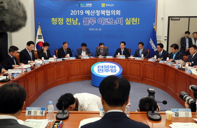 김영록 전남도지사는 16일 국회 더불어민주당 당대표실에서 열린 ‘더불어민주당-전라남도 예산정책협의회'에서 전남도 예산 및 정책현황을 설명하고 지원과 협조를 부탁했다.
