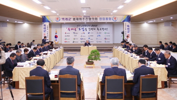 지난 16일 충북 단양군청에서 전국 24개 군 단위 지자체장과 관계자 등 100여 명이 참석한 가운데 특례군 법제화추진협의회 창립총회가 열렸다. 추진협의회는 창립총회에서 단양군수(류한우)를 회장으로 선출하고 추진 경과를 보고하고 부의안건 심의 및 특례군 법제화를 촉구하는 공동협약서에 서명했다.