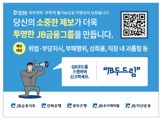 한편 JB금융지주는 지난해부터 윤리경영강화와 부패방지경영시스템을 도입하고, 부패방지책임자와 내부 감사 등을 통해 부패방지경영을 실시해 오고 있다.