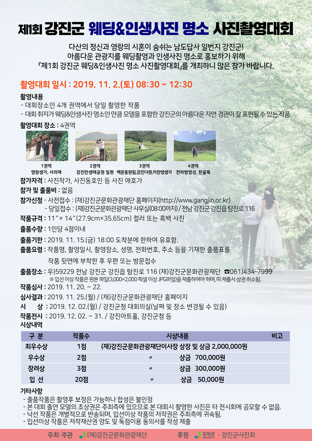 임석 (재)강진군문화관광재단 대표이사는 “이번 사진촬영대회를 통해 강진군의 아름다운 자연경관과 역사성을 지닌 장소가 인생을 새롭게 시작하는 예비신혼부부들이 소중한 첫발을 내딛는 공간으로 각광 받길 바란다. 전국 유명 사진작가 및 사진애호가 등 국민들의 많은 참여와 좋은 작품을 기대한다”고 덧붙였다.