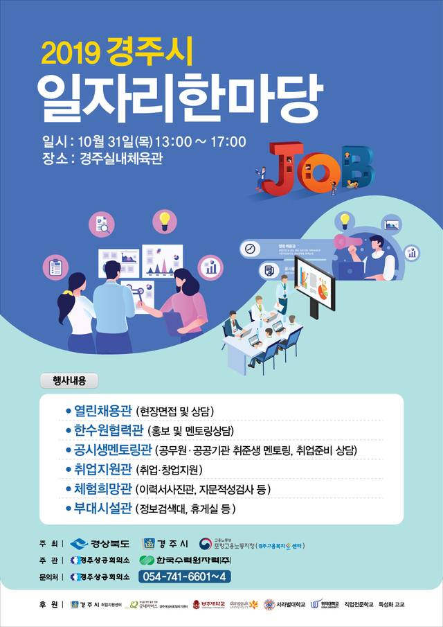 취업지원관에는 동국대학교경주캠퍼스 등 20개 유관기관이 참여해 취업컨설팅, 일학습병행제, 취업성공패키지, 소상공인창업지원 등을 홍보하며, 희망체험관에는 지문적성검사, 성격유형검사, 이력서사진 무료촬영 등 다양한 부대행사를 준비하고 있다.