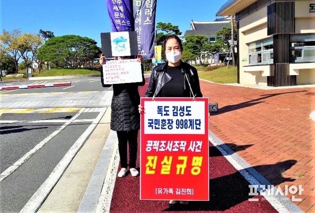 독도 이장을 지냈던 故김성도 씨 유족 측이 22일 오전 경북도청 앞에서 “고인의 목련장 수상과정에 독도 물골 998 계단 조성에 대한 공적이 조작됐다”며 1인 시위를 가졌다.