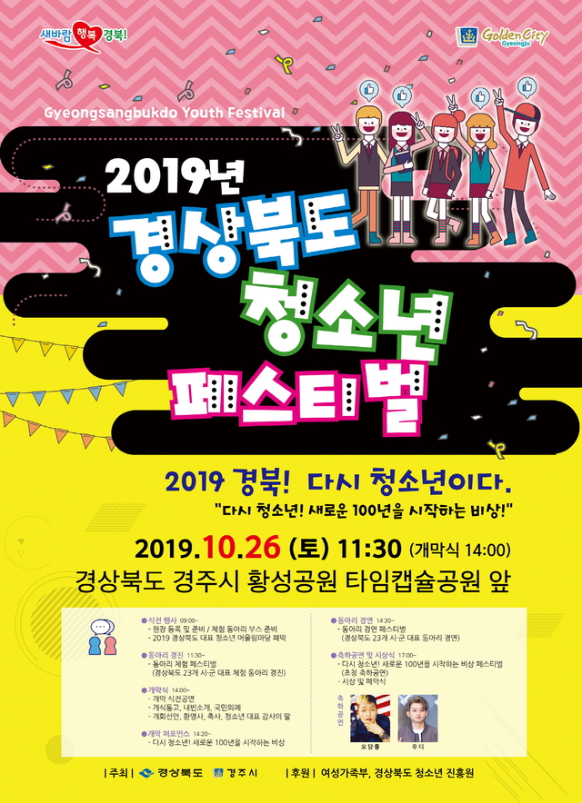 경북도와 경주시가 공동 주최하고 여성가족부, 경상북도청소년진흥원이 후원하는 ‘2019년 경상북도 청소년 페스티벌’은 40여개 청소년동아리 2000여명이 참석한다.
