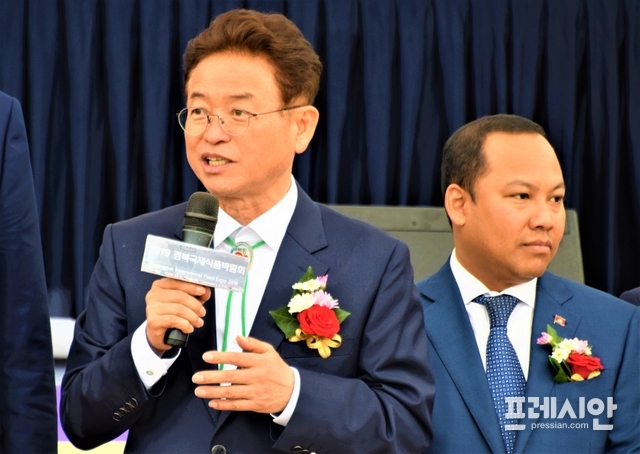 ▲ 이철우 경북도지사(왼쪽)가 2019 경북국제식품박람회에서 기념사를 하고있다. ⓒ프레시안(박종근)