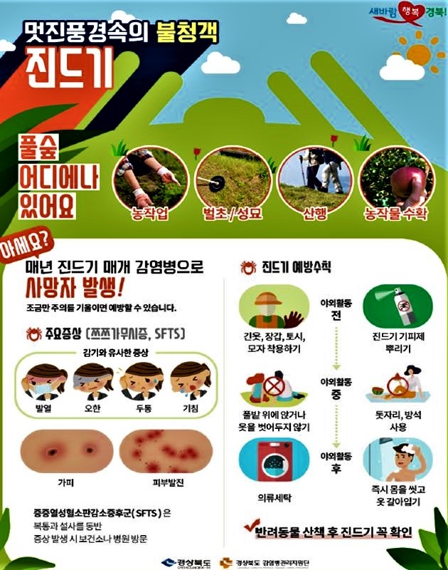 김재광 경북도 복지건강국장은“야외활동 후 2주 이내에 고열, 구토, 오한과 같은 심한 감기증상이 있거나 벌레에 물린 곳이 있으면 즉시 의료기관을 찾아 진료를 받아야 된다”고 밝혔다.