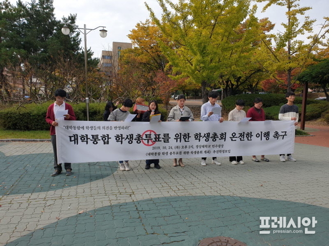 학내에서 학생들이 직접 시위를 주최하고 목소리 낸 건 이례적인 일이다"며 "피켓 시위에 이어 우리 학생들은 ‘<대학 통합 학생총투표를 위한 학생총회 개최> 추진학생모임(이하 총회 추진모임)’을 결성해 학생총회 개최 및 학생총투표를 위한 움직임을 이어나갔다. 약 5일간 경상대학 각 캠퍼스에서 서명운동을 벌였고 지난 22일 총학생회 측에 학생 1536명의 연서를 전달했다"고 밝혔다.