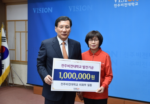 29일 전북 전주비전대학교에 따르면 학교 청소미화원으로 근무하는 김연옥 씨와 동료 19명이 십시일반 모은 장학금 100만 원을 대학에 전달했다.