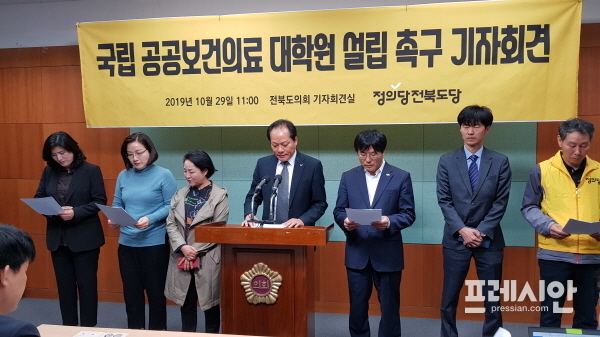정의당 전북도당이 29일 전북도의회 브리핑룸에서 기자회견을 갖고 '의료취약지역의 의료인력 양성을 위한 국립공공보건의료대학 설립을 위해 정부와 국회의 책임있는 행동'을 촉구했다.