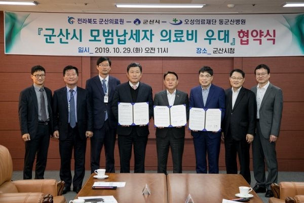 29일 전북 군산시에 따르면 군산의료원, 동군산병원과 '군산시 모범납세자 의료비 우대 협약식'을 체결했다.