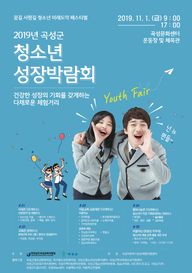 두 번째, 오는 11월 1일 곡성군에서는 처음으로 개최되는 청소년 성장 박람회를 꼽을 수 있다. 청소년 성장박람회는 지난 4월 한국청소년정책연구원에서 공모한 ‘청소년 성장지원 정책 추진체계 구축 시범사업’에 선정되어 추진하게 됐다.