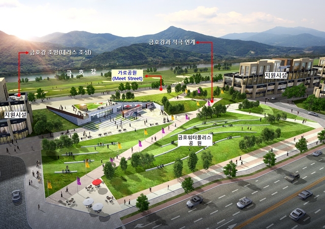 특히 대구시역을 지나는 금호강 구간 중 금호워터폴리스 주변은 하천폭이 가장 넓고 수량이 풍부하여 수려한 금호강 수변 공간과의 연계를 위해 제방도로(폭 10m) 및 단지내 제방사면 성토 구간(15m)과 공공공지 및 경관녹지(폭 5m)를 확보하고, 지구단위계획 수립시 건축선 이격(5m) 등으로 금호강과 단지사이에 최대 35m정도의 가로공원을 확보하게 됨에 따라 명물 테마거리가 될 수 있도록 조성할 계획이다.
