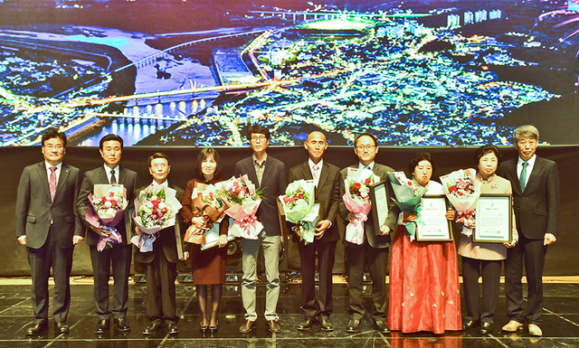 ▲지난 1일 강원 영월군 스포츠파크 실내체육관에서 열린 제37회 영월군민의 날 기념식에서 최명서 영월군수와 군민대상 수상자와 가족들에 대한 시상식을 마치고 기념촬영 하고 있다. 이날 ‘모범군민상’ 수상자는 김대현(소득증대) 영월농협가공사업소장과 이정복(사회봉사)씨 등 6명이다. ⓒ영월군