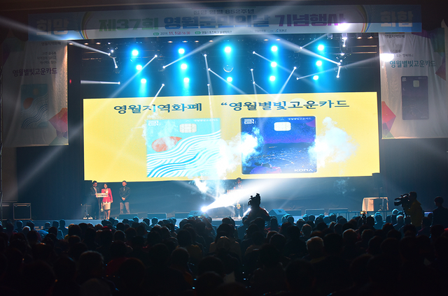 ▲지난 1일 강원 영월군 스포츠파크 실내체육관에서 열린 정명 영월 852주년 ‘제37회 영월군민의 날’ 기념식에서 체크 카드형 영월지역 화폐인 ‘영월별빛고운카드’출시 선포식이 열리고 있다. ⓒ영월군