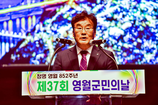 ▲지난 1일 강원 영월군 스포츠파크 실내체육관에서 개최된 정명 영월 852주년 ‘제37회 영월군민의 날’ 기념식에서 최명서 영월군수가 기념사를 하고 있다. ⓒ영월군