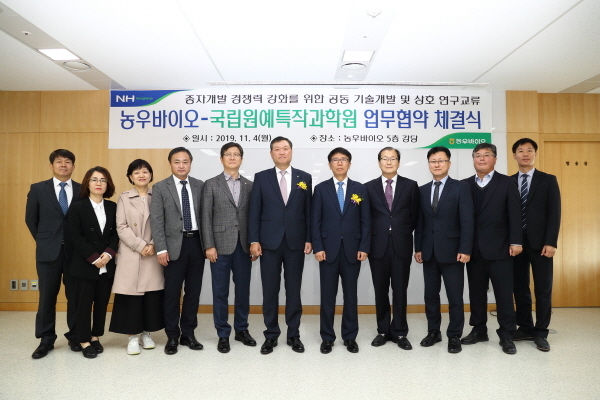국립원예특작과학원과 주식회사 농우바이오는 4일 농우바이오 본사(경기도 수원)에서 '수요자 맞춤형 민간 첨단육종 지원 상호 협력과 교류에 관한 협약'을 맺었다.
