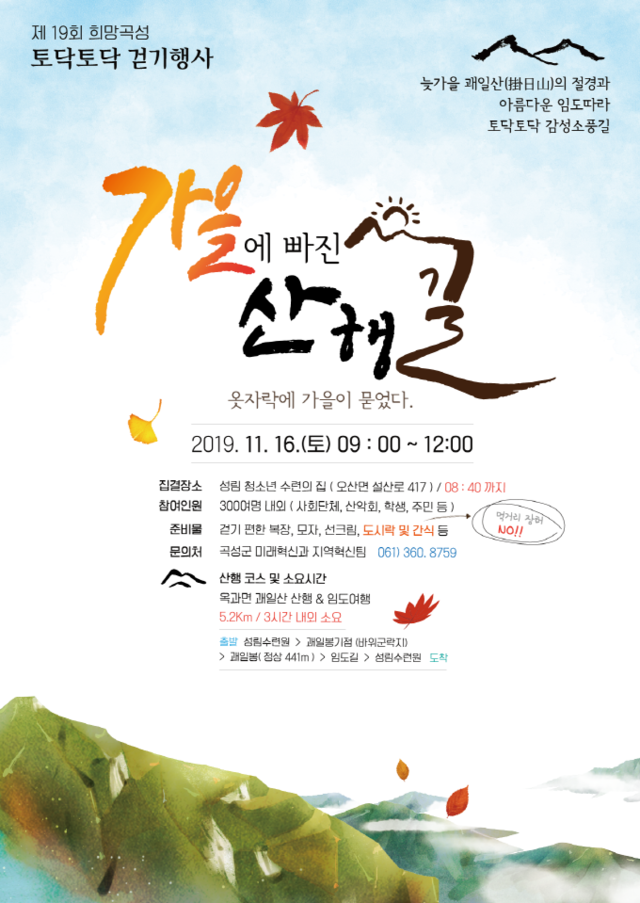 오는 16일 절정에 이른 가을단풍과 함께 옥과면 괘일산에서 금년 마지막 곡성군 토닥토닥 걷기 행사가 개최된다.