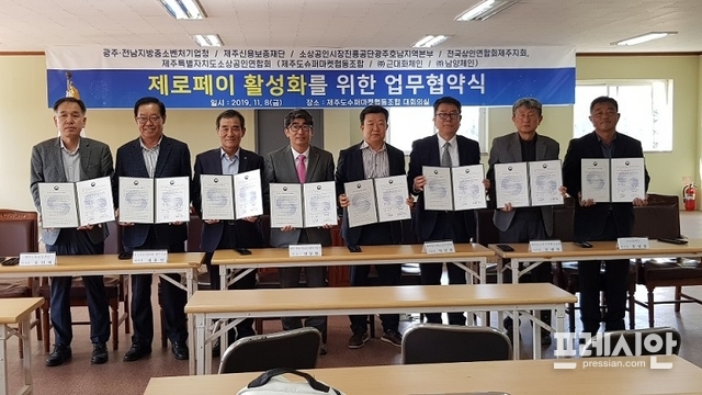 광주·전남지방중소벤처기업청(청장 김문환)은 8일 제주지역 소상공인의 제로페이 가맹점을 확산하고 소비자 이용을 촉진하기 위해 제주도수퍼마켓협동조합 대회의실에서 제주지역 소상공인 지원기관과 단체 등이 참석한 가운데 모바일 직불결제(이하 제로페이) 활성화 업무협약을 체결했다.