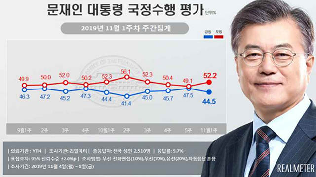 여론조사 전문기관 리얼미터는 11월 1주차 주간집계에서 문 대통령의 지지율이 지난주보다 3.0%p 내린 44.5%를 기록했다고 11일 밝혔다.