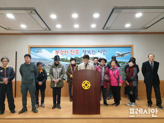 경남 진주시 옥봉동 LH 행복임대주택 건설현장 인근 주민들은 12일 오전 진주시청 브리핑룸에서 기자회견을 갖고 "공사현장에서 발생하는 소음, 작업 먼지, 건설기계 작업으로 발생하는 진동 등의 피해에 대한 보상"을 촉구했다.