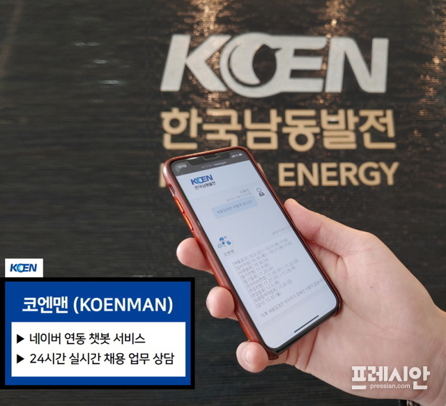 남동발전의 코엔맨은 1000여개 질문데이터를 학습, 구직자의 채용 관련 문의사항을 즉문즉답으로 해결할 수 있고 모바일로도 동일 서비스를 제공한다.