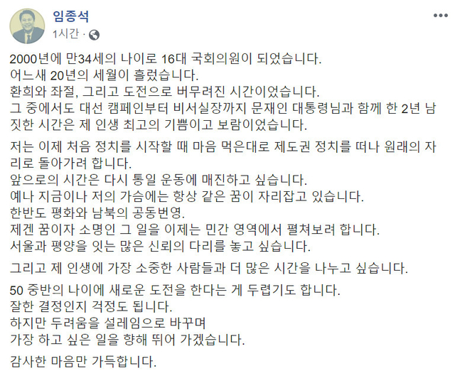 임 전 실장은 이날 자신의 페이스북에 글을 올리고 "제도권 정치를 떠나 원래의 자리로 돌아가려 한다"며 "앞으로의 시간은 다시 통일 운동에 매진하고 싶다"고 했다.