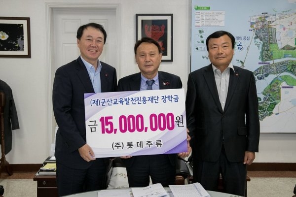 롯데주류 김태환 대표이사는 19일 강임준 군산시장에게 군산지역 인재양성을 위한 장학금을 전달했다.
