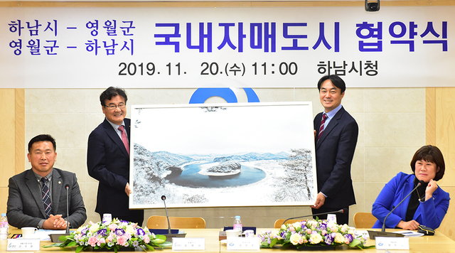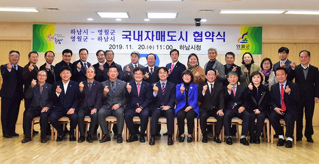 ▲20일 강원 영월군(군수 최명서)과 경기 하남시(시장 김상호)는 하남시청 상황실에서 양 도시 간 상생협력과 교류를 위한 국내 자매도시 협약을 체결한 뒤 관계자들이 기념촬영하고 있다. ⓒ영월군