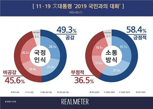 '2019 국민과의 대화'에서 문 대통령이 밝힌 국정인식에 대해선 ‘공감한다’는 응답이 ‘공감하지 않는다’는 응답률 45.6%보다 오차범위 내인 3.7%p 높은 49.3%로 집계됐다.