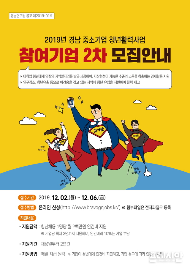 경남 진주시는 중소기업과 청년의 일자리 미스매치 해소와 청년일자리 제공을 위한 ‘경남 중소기업 청년활력사업’에 참여할 기업(1개 기업)을 12월 2일부터 6일까지 추가로 모집한다고 밝혔다.