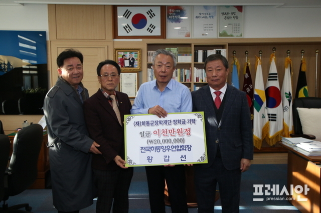 (재)하동군장학재단은 황갑선 전국하동향우연합회장이 21일 군수 집무실을 찾아 고향 후배들에게 써달라며 장학기금 2000만 원을 기탁했다고 밝혔다.