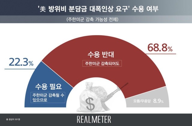 25일 여론조사기관 리얼미터가 YTN 의뢰로 지난 22일 전국 성인 502명을 대상으로 주한미군 감축 가능성을 전제로 미국의 대폭 인상 요구 수용 여부에 대한 의견을 물은 결과, '주한미군이 감축되어도 수용해서는 안 된다'는 '수용 반대' 응답이 68.8%로 조사됐다. 응답자의 3분의 2 이상이 '수용 반대' 의견을 낸 것.