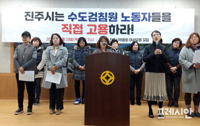 민중당 진주지역위원회 여성당원모임은 28일 진주시청 브리핑룸에서 기자회견을 열고 “수도검침원 노동자들을 직접 고용하고 공공기관부터 비정규직을 줄이고 정규직 전환에 앞장서라”고 촉구했다.