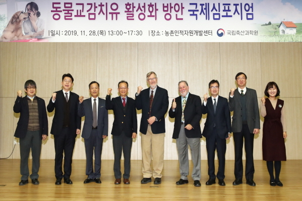 28일 오후 전북 전주시 농촌인적자원개발센터에서 열린 '동물교감치유 활성화방안 국제심포지엄'에서 문홍길 농촌진흥청 국립축산과학원 축산생명환경부장과 참석자들이 기념촬영을 하고 있다. ⓒ농촌진흥청