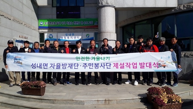 성내면은 33명으로 구성된 제설자율방재단 발대식을 갖고 제설작업에 투입되는 트랙터 제설기 16대를 점검했다.