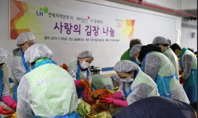 2일 LH에 따르면 LH 전북지역본부 직원 30여명과 대한적십자사 회원 등 총 50여명은 지난 달 말 전주시 덕진구 송천동에 위치한 솔내문화복지관에서 도내 장애인, 저소득청소년, 경로당, 한부모가정 등 취약계층 500여 가구에 전달할 김장김치를 담궜다.