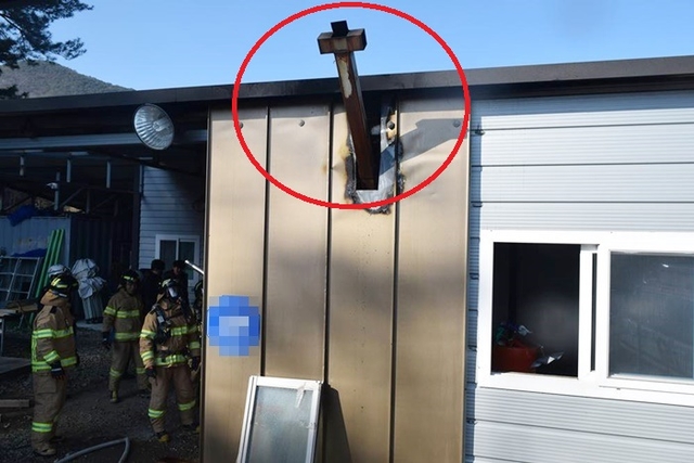 소방당국은 화목난로 연통이 샌드위치패널 벽면을 통과하는 부분에서 과열돼 그 열기가 패널벽면에 옮겨 붙은 것으로 보고 있다.