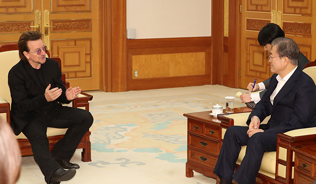 문 대통령은 9일 오전 청와대에서 40분간 보노를 만난 자리에서 "한국 공연의 성공을 축하드린다"며 "음악 활동을 매개로 평화, 인권, 그리고 또 기아나 질병 퇴출 같은 사회 운동까지 함께 전개하시고 또 아주 많은 성과를 내신 데 대해서 아주 경이를 표한다"고 밝혔다.