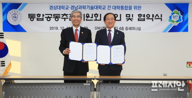국립 경상대학교(GNU)와 경남과학기술대학교(GNTECH)는지난 10일 경상대학교 GNU컨벤션센터 4층 중세미나실에서 양 대학 ‘통합공동기획위원회’ 및 ‘통합공동추진위원회’ 연석회의를 열고 대학통합을 심의·의결했다. 이어 통합 협약을 체결했다.
